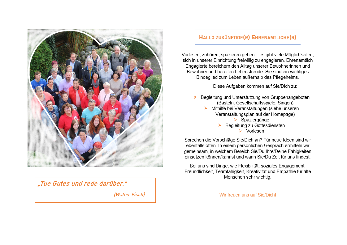 Ehrenamtlich Engagierte bereichern den Alltag unserer Bewohnerinnen und Bewohner und bereiten Lebensfreude. Sie sind ein wichtiges Bindeglied zum Leben außerhalb des Pflegeheims.
